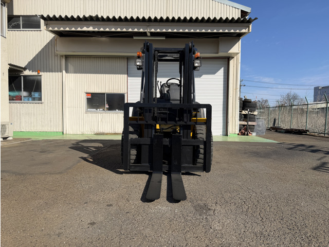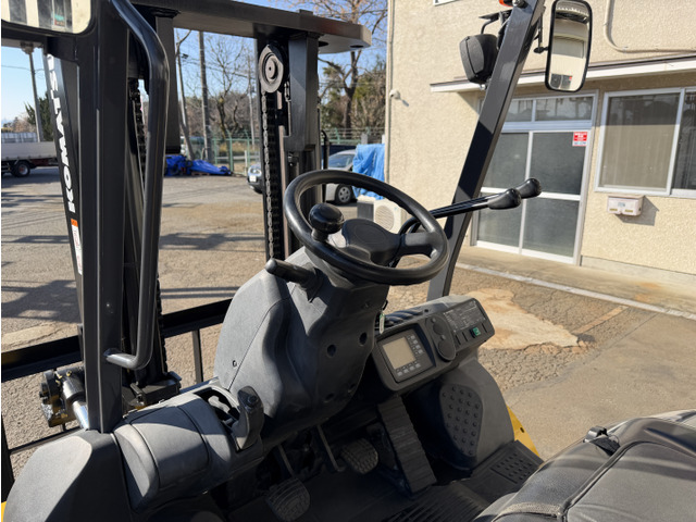 揚高3m・2段Vマストの標準仕様に加え、ノーパンクタイヤ・シートヒーターを装備しており、屋外ヤードや過酷な作業環境での実用性を重視した構成です。